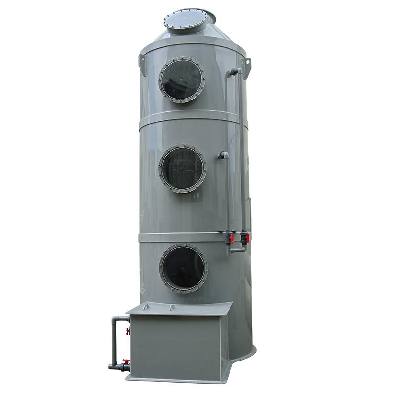 PPs阻燃噴淋塔廢氣處理原理:PPs噴淋塔處理廢氣機制為氣液逆流接觸。以酸性廢氣為例,酸性廢氣由塔底進入,pp噴淋塔循環(huán)水泵開啟后,水箱內堿性液體由塔頂進入,經過噴淋裝置(噴嘴)噴成霧狀或雨滴狀;氣液逆流,在填料層酸堿中和。凈化后氣體經過除霧大小頭后排出。--噴淋塔的結構組成:酸堿廢氣塔分單塔體和雙塔體以及立式噴淋塔與臥式噴淋塔。用法蘭分段連接而成。具體由貯液箱、塔體、進風段、噴淋層、填料層、旋流除霧層、出風錐帽、觀檢孔等組成。